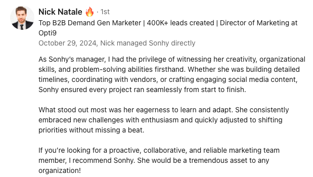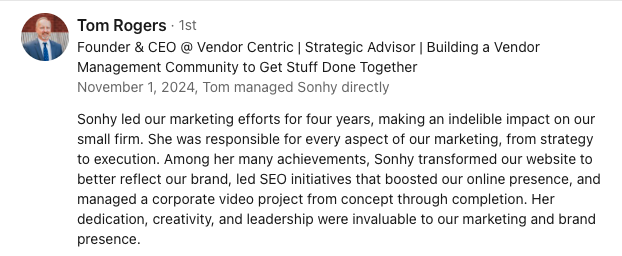 I’ve led initiatives that improve organic visibility, optimize site structure and strengthen conversion paths, ensuring content supports every stage of the buyer journey from discovery to decision. I thrive in B2B environments where messaging, SEO and sales alignment are critical to moving deals forward.